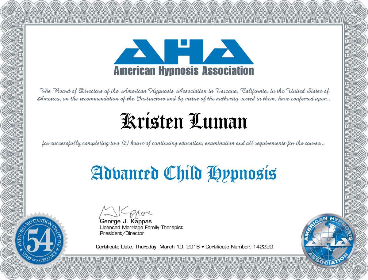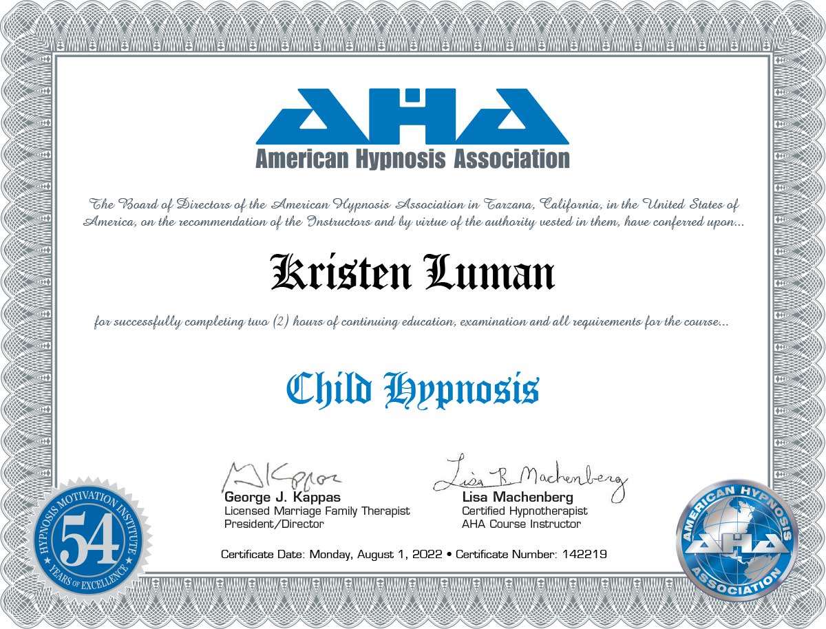 There, she achieved honors as a Certified Hypnotherapist and became a member of the American Hypnosis Association. She also works as an instructor of Guided Imagery Meditation at Unplug Meditation. Kristen’s expertise in Early Childhood Development and certifications in Child and Advanced Child Hypnotherapy have enabled her to work with clients of all ages, while educating parents on how to foster positive behavior through better communication.